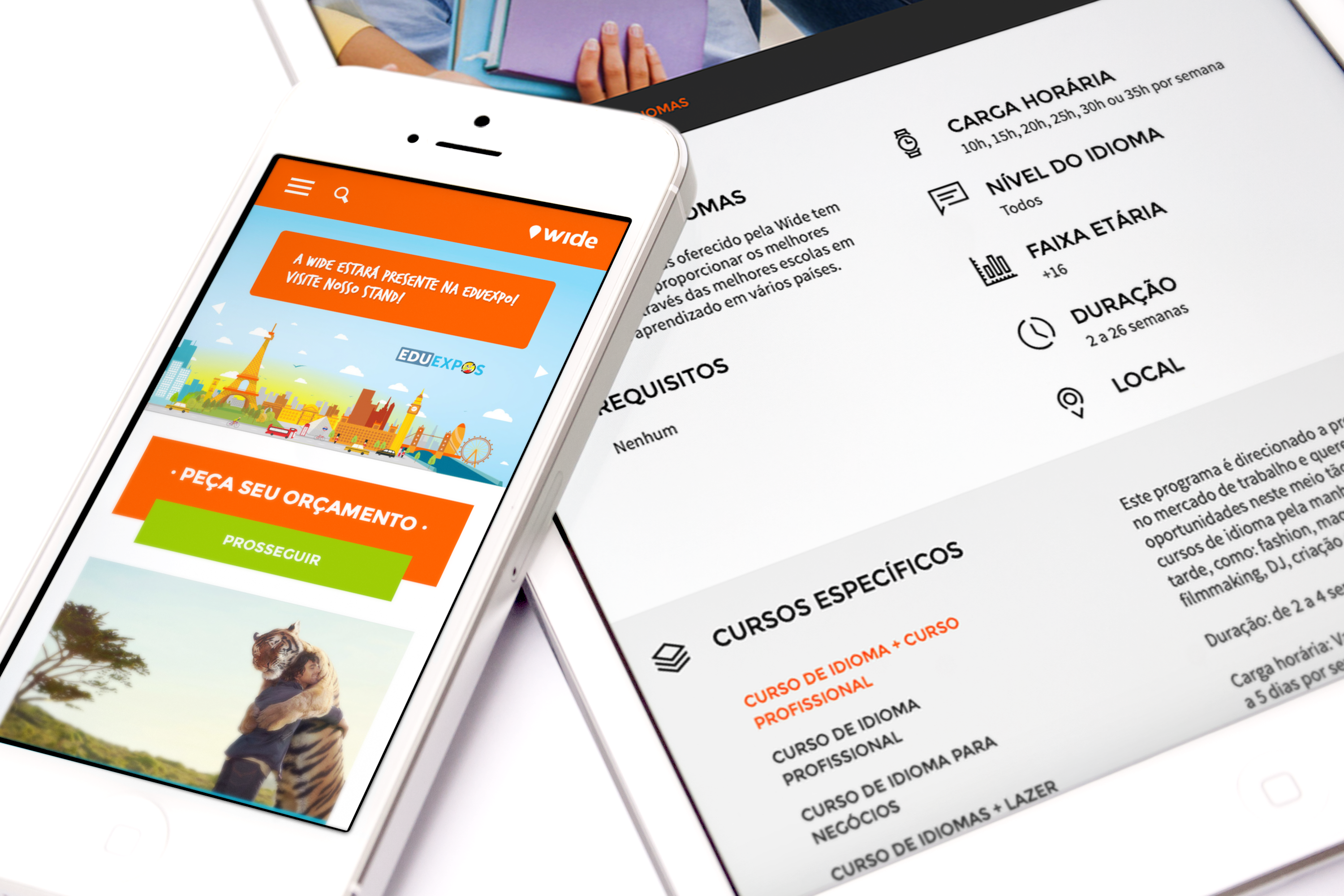 A wide oferece pacotes tanto para jovens que querem explorar outros países assim como para adultos e idosos que querem se profissionalizar. O desafio foi criar uma interface fácil de usar para todos os tipos de pessoas, deixando os conteúdos mais importantes em destaque.