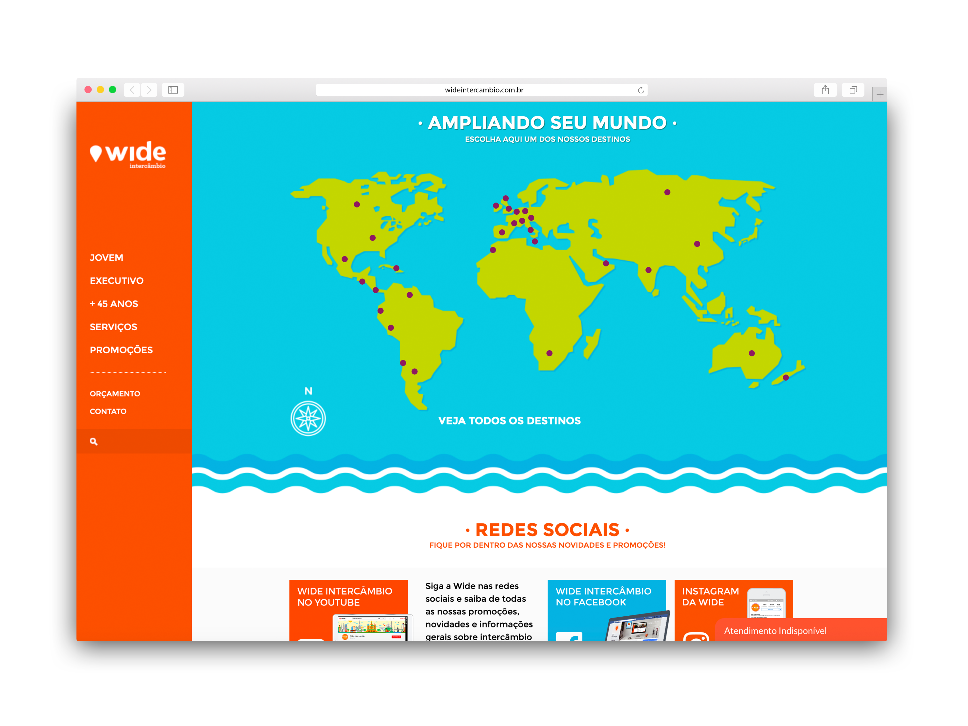A Wide é uma agência de intercâmbio sediada em Recife, PE. Com seriedade e profissionalismo, oferece programas de intercâmbio de diversos tipos, fornecendo as informações necessárias e suporte integeral para quem precisa aprender um novo idioma, dar uma alavancada na carreira ou simplesmente vivenciar uma nova cultura. Seu novo site pedia uma cara moderna e descontraída, sendo fácil de usar por pessoas de diferentes idades e perfis.